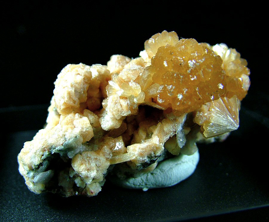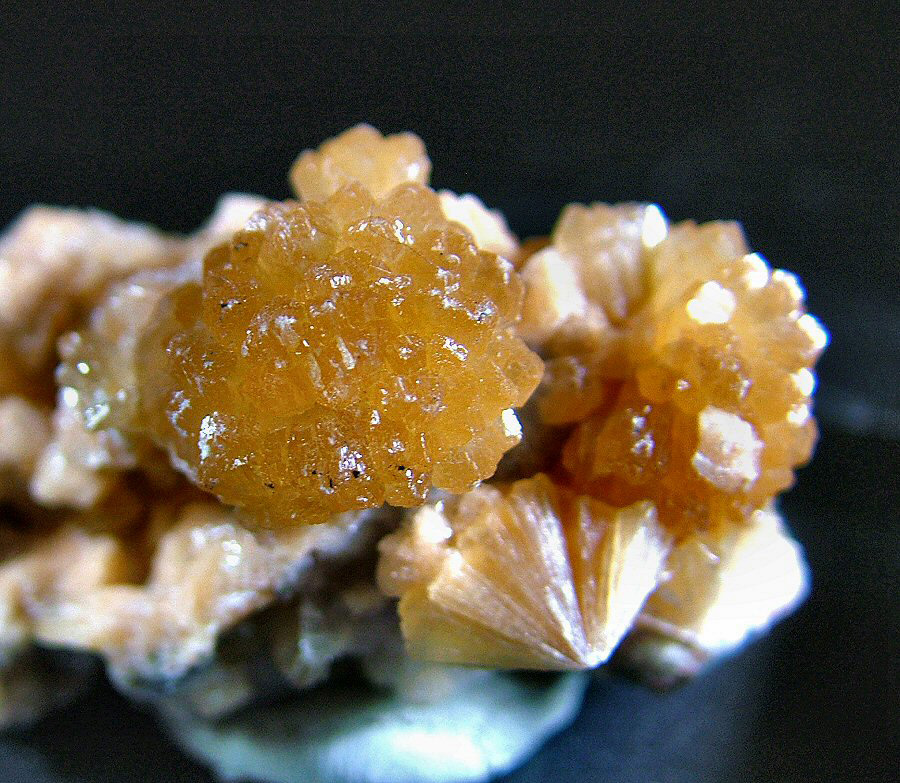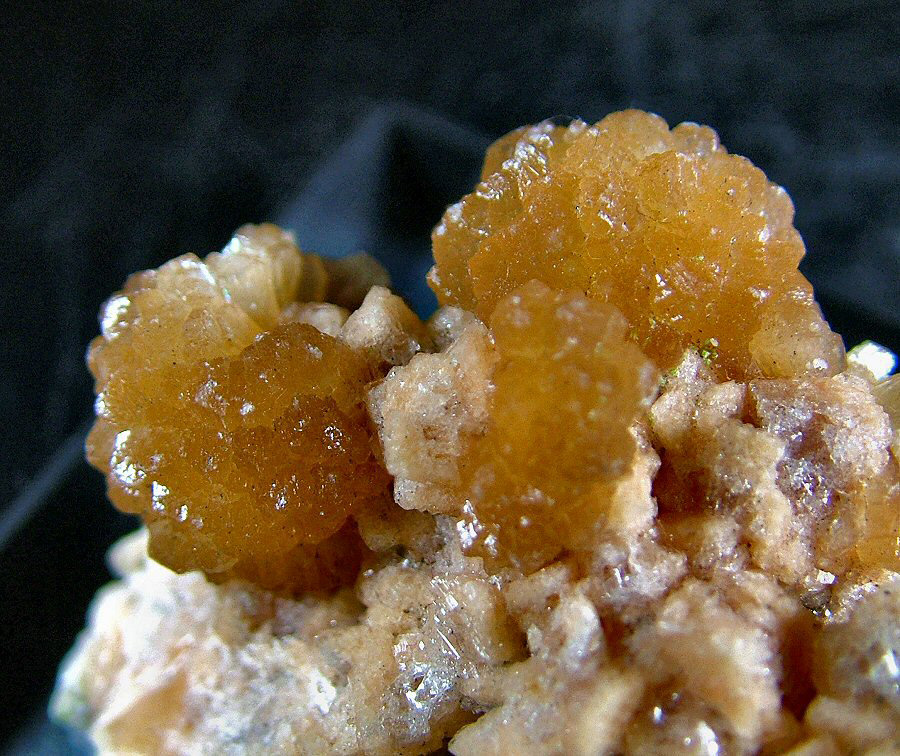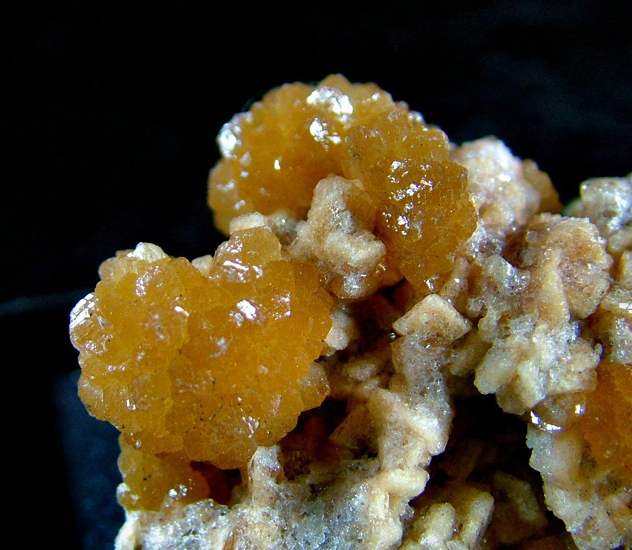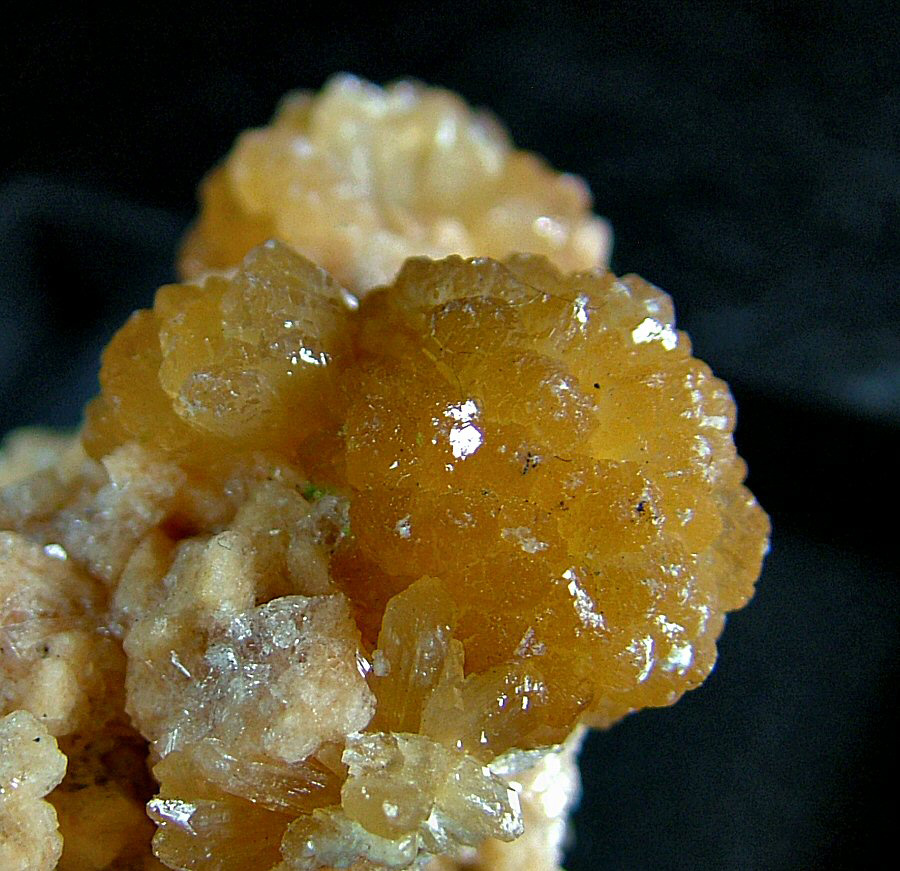 Marvelous sample of Stellerite with amber color, in 16 mm spheroidal aggregates, glossy and elegantly laid on a carpet of small pink Chabazite's crystals. Very aesthetic, photographed under strong light.
