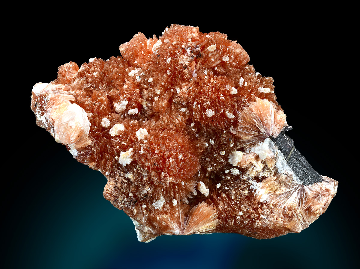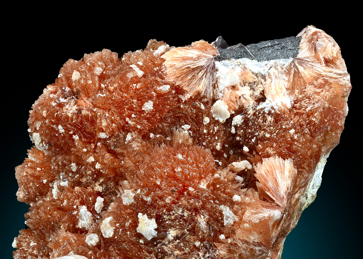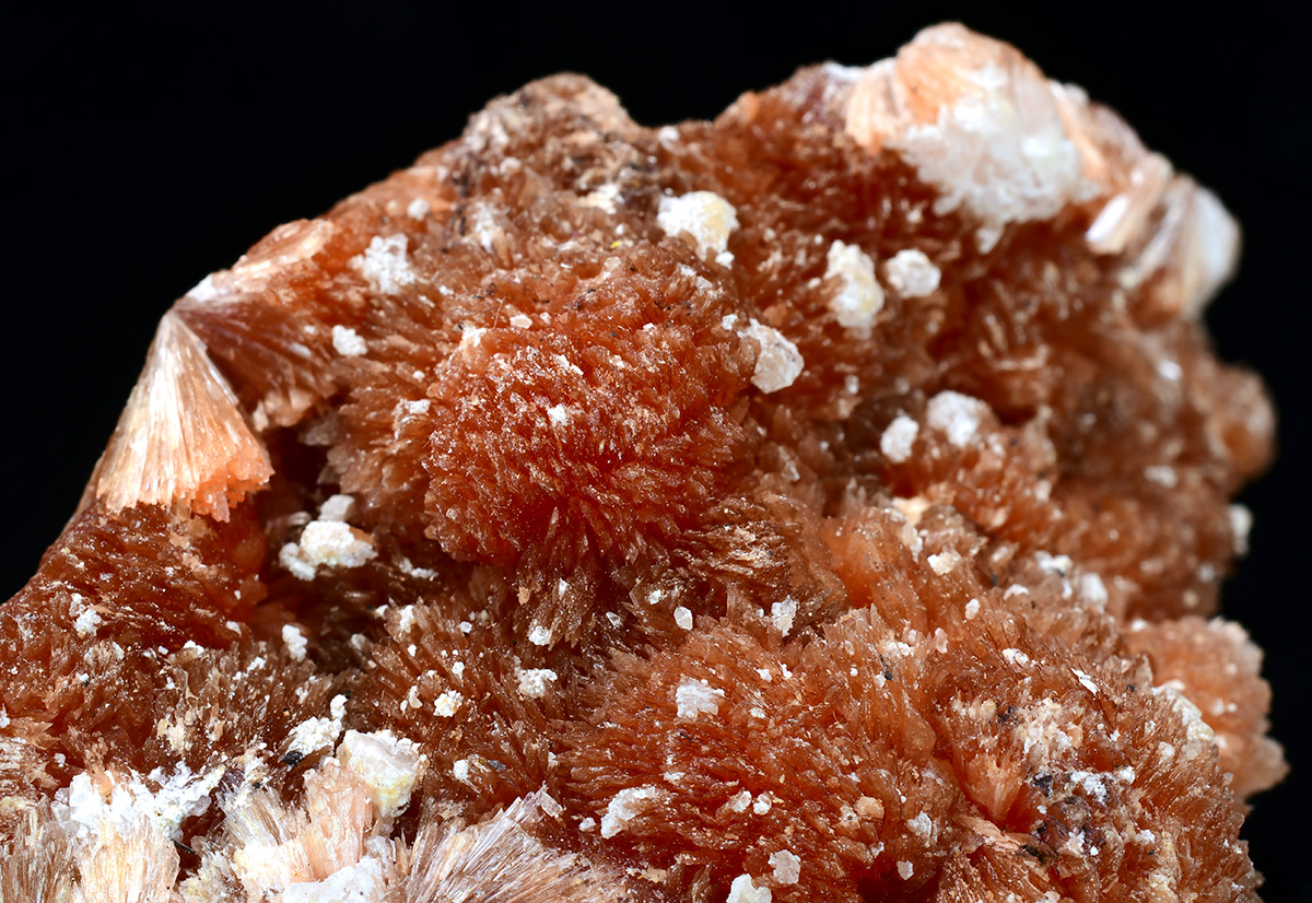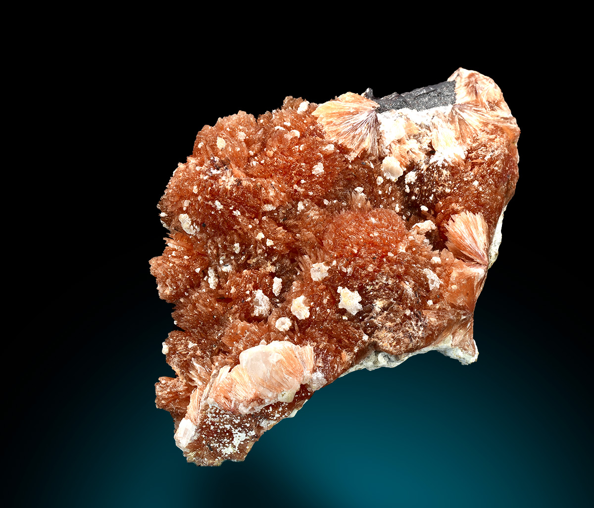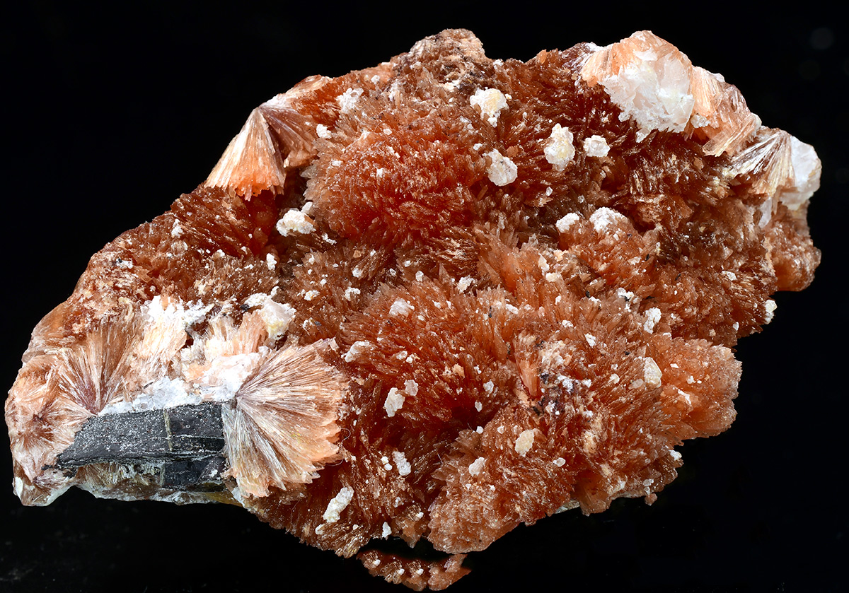 Specimen of this classic from the Kalahari manganese fields. It features rich sphere up to 10 mm and sprays crystals up to 7 mm, of deep salmon color on matrix.