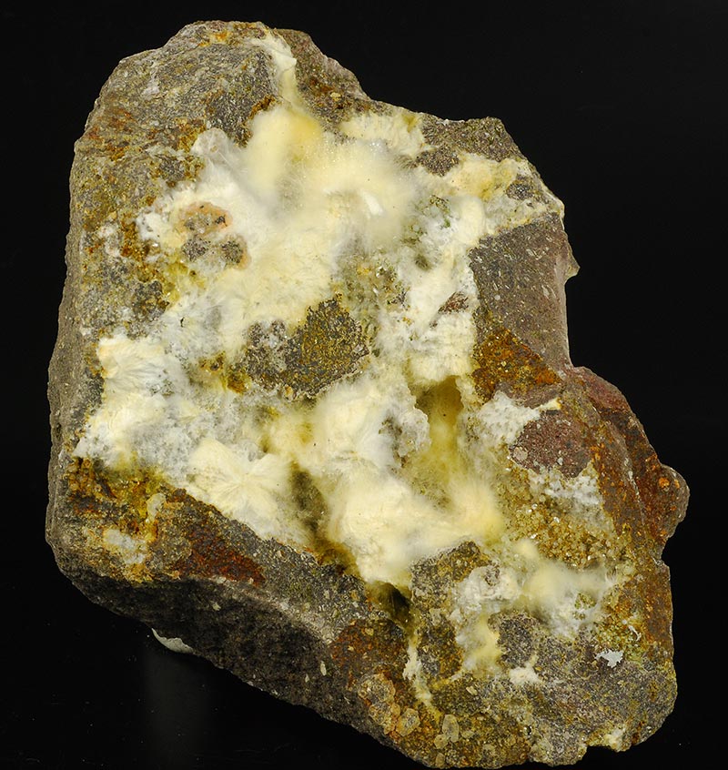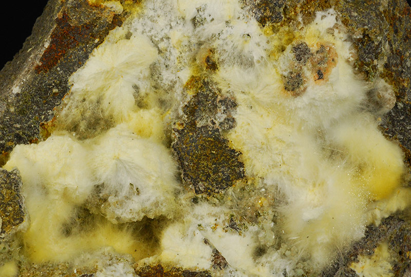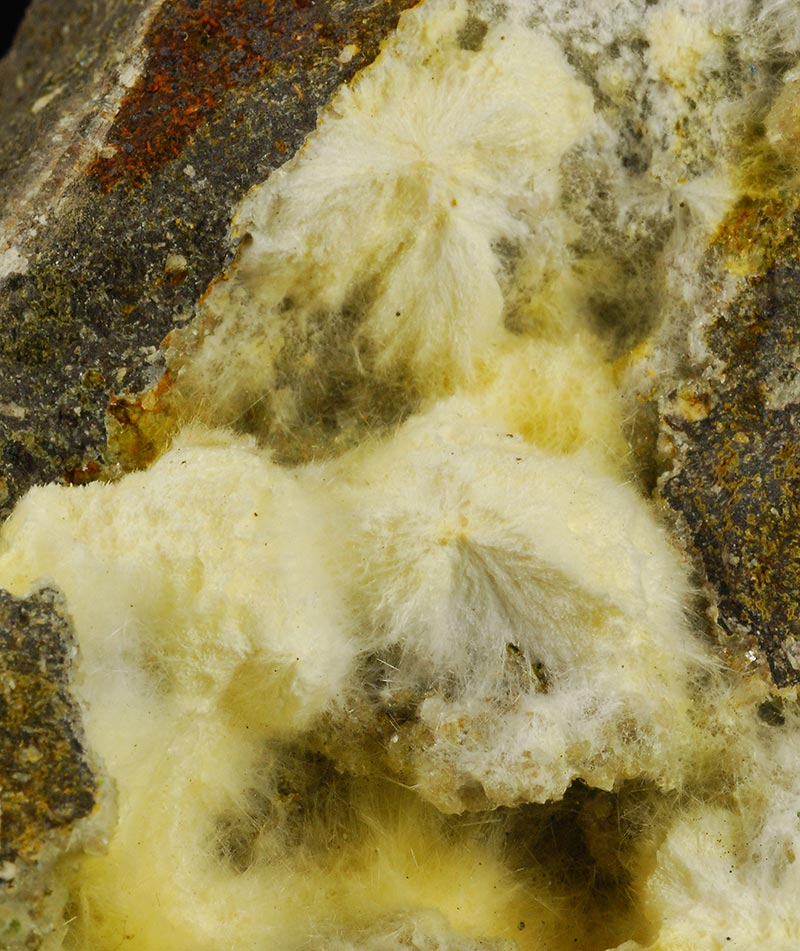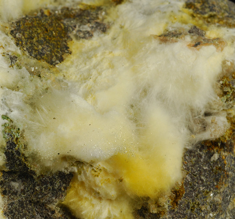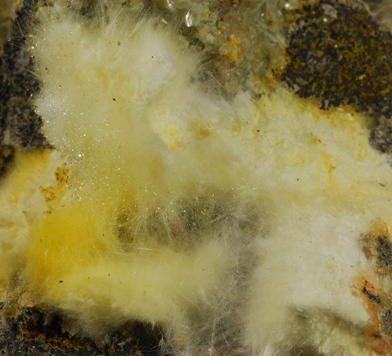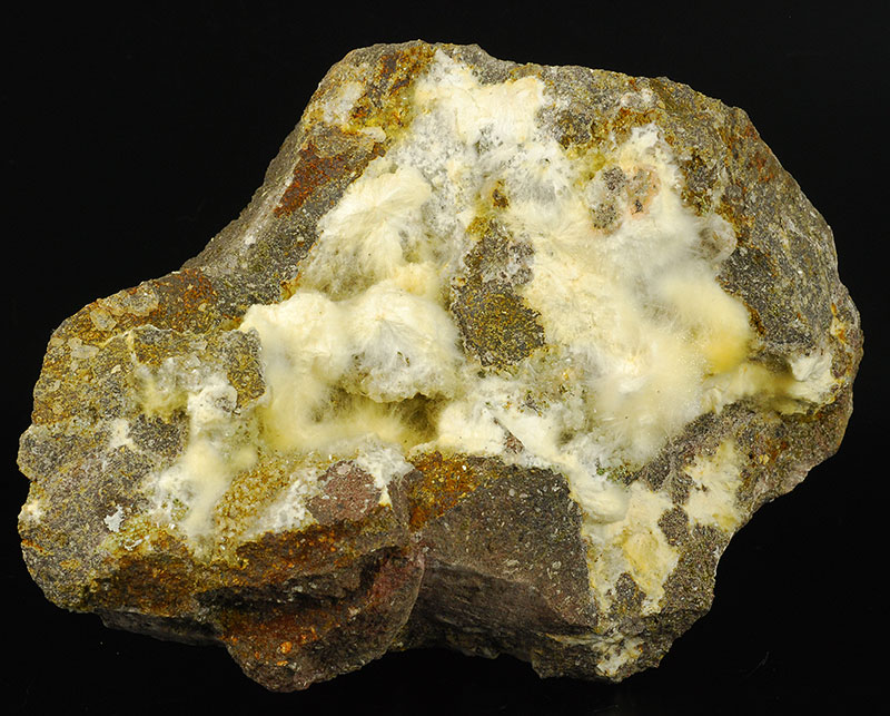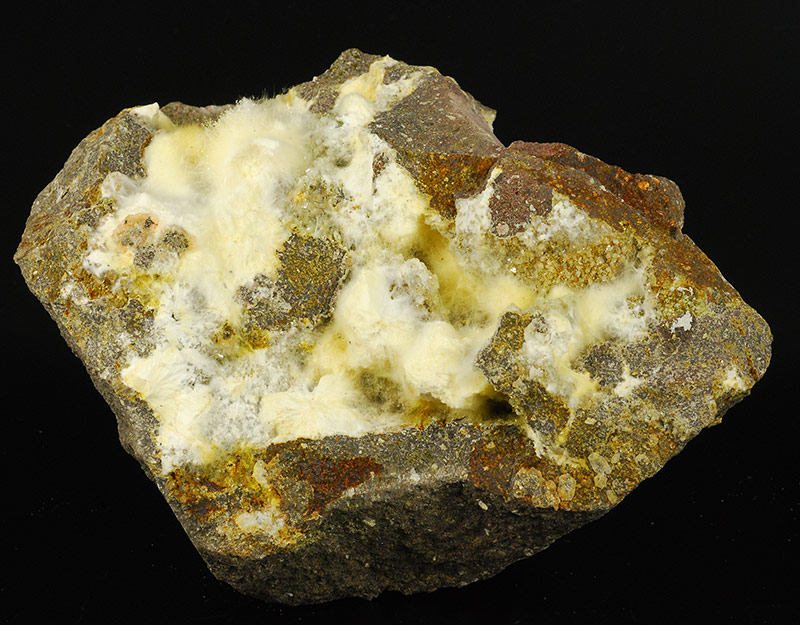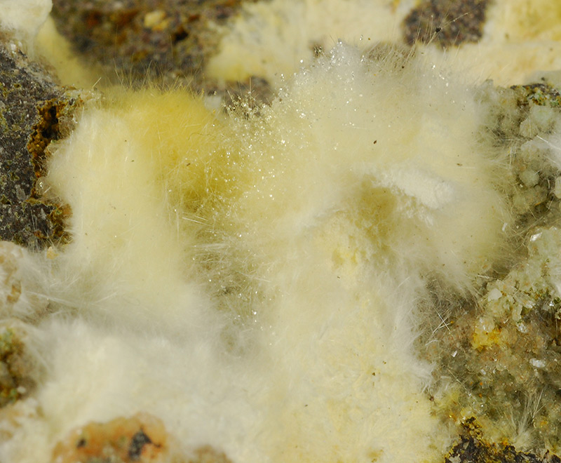 Several cottony tufts of white mordenite cover almost entirely, but in a chaotic manner, the surface of this Sardinian specimen.