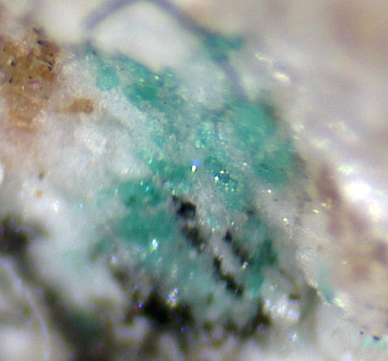 Tiny but nice greenish-light blue gordaite xx on matrix with deep green paratacamite and minor schwarzenbergite.