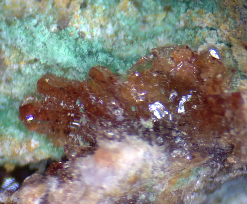 Red-brown destinezite xx with yellow copiapite xx.