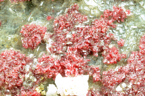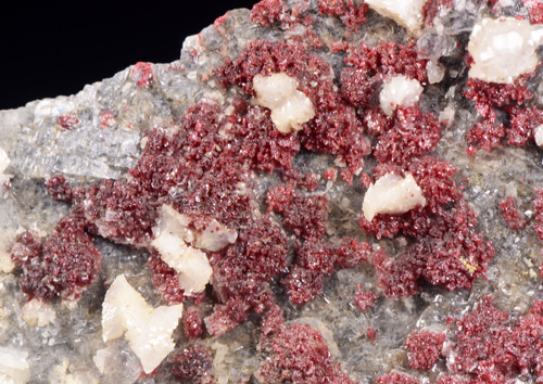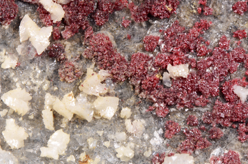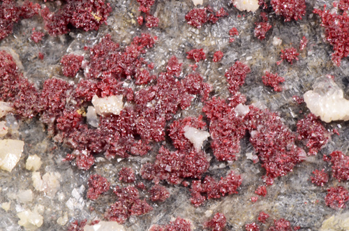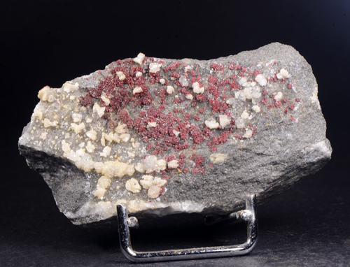 Oldtimer of Cinnabar featuring clean red aggregates of micro crystals scattered on matrix, associated with white Dolomite in distorted rombohedra, and colourless Quartz. This piece is not from the Mt. Amiata occurrences in the province of Siena which is far more common but from one of the most known mines in the "Colline Metallifere" in the Province of Grosseto!