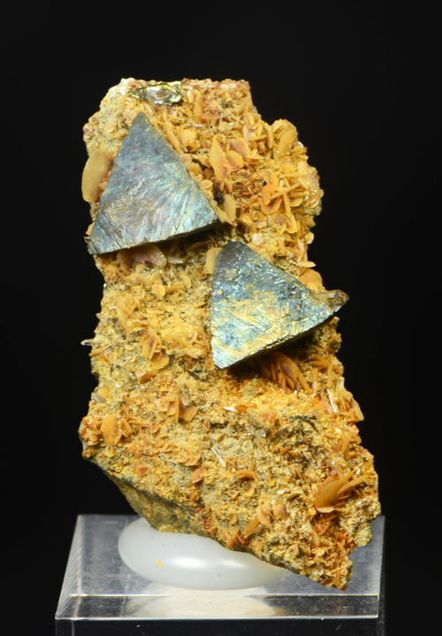 Stunning sample featuring two perfect bisphenoidal chrystals of Chalcopyrite froma famous italian locality. Textbook old sample!