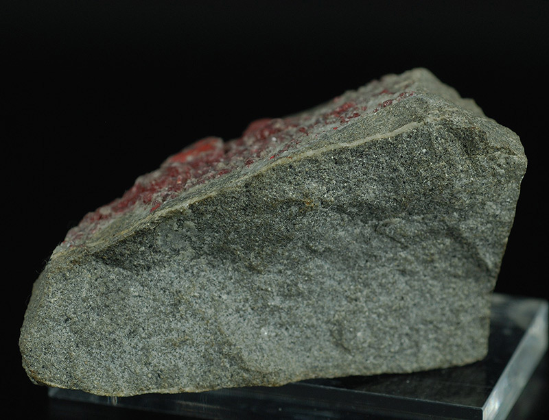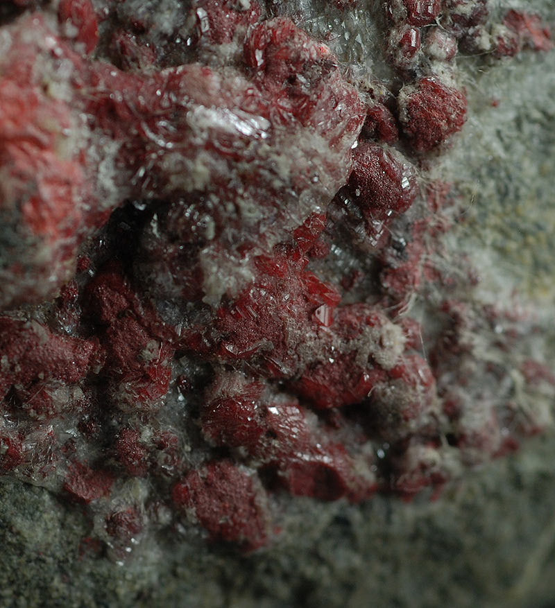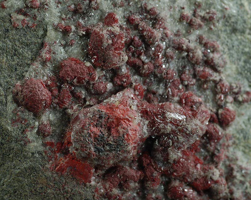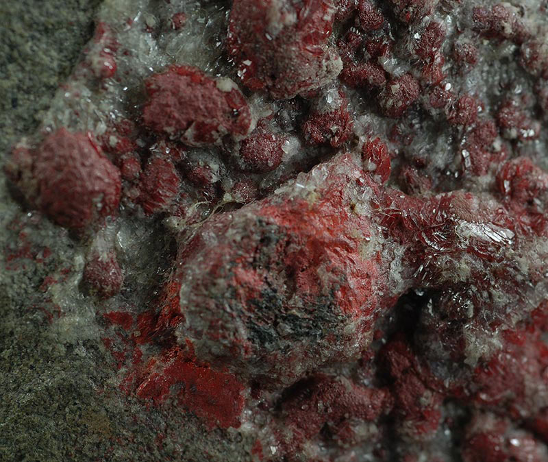 Numerous dark red cherries are visible on the surface of the sample. They are cinnabar, in the typical crystallization of these areas.