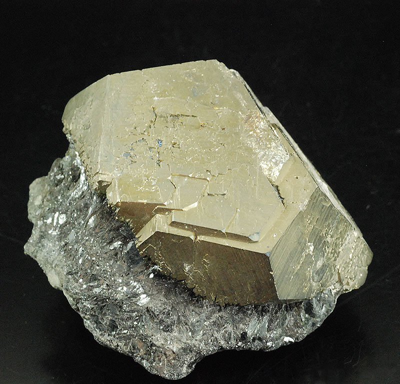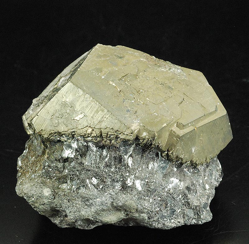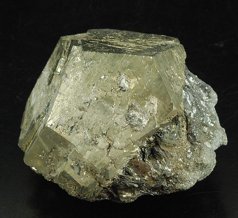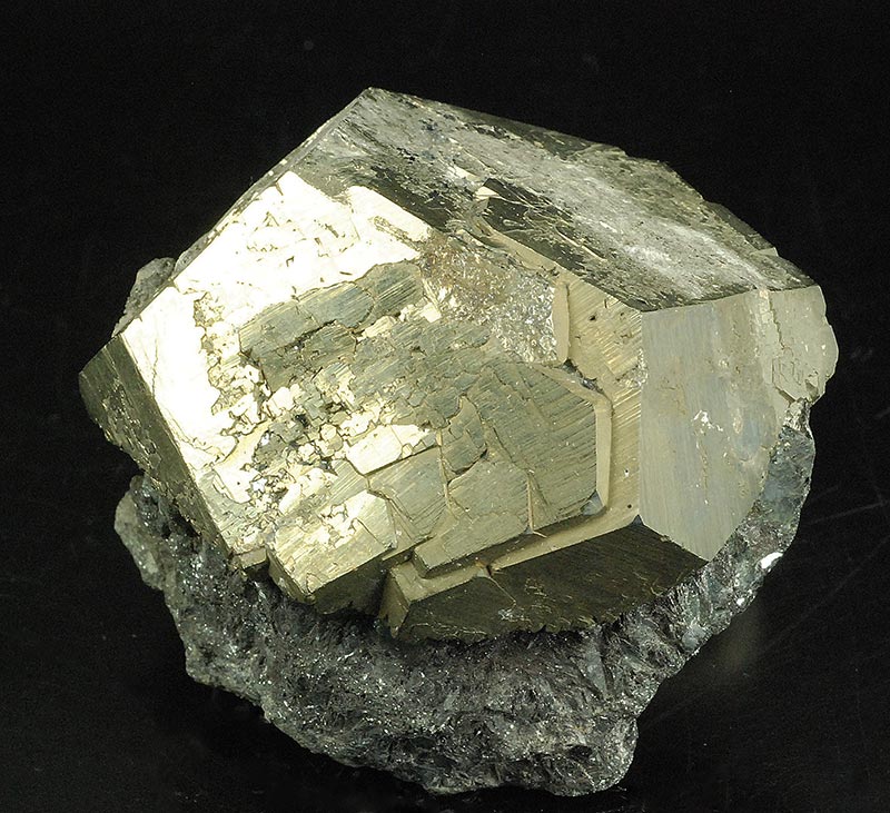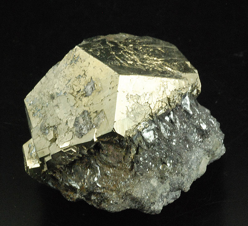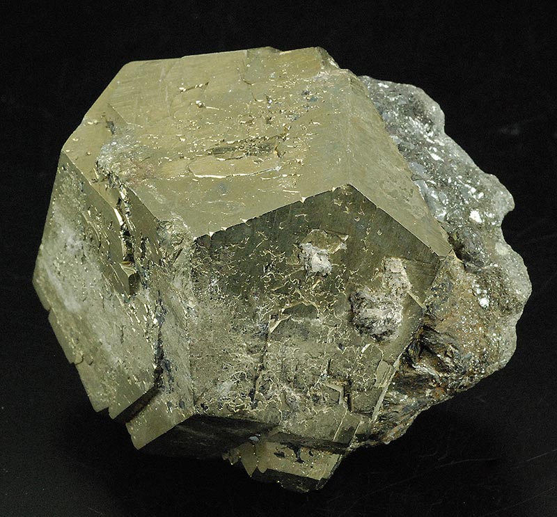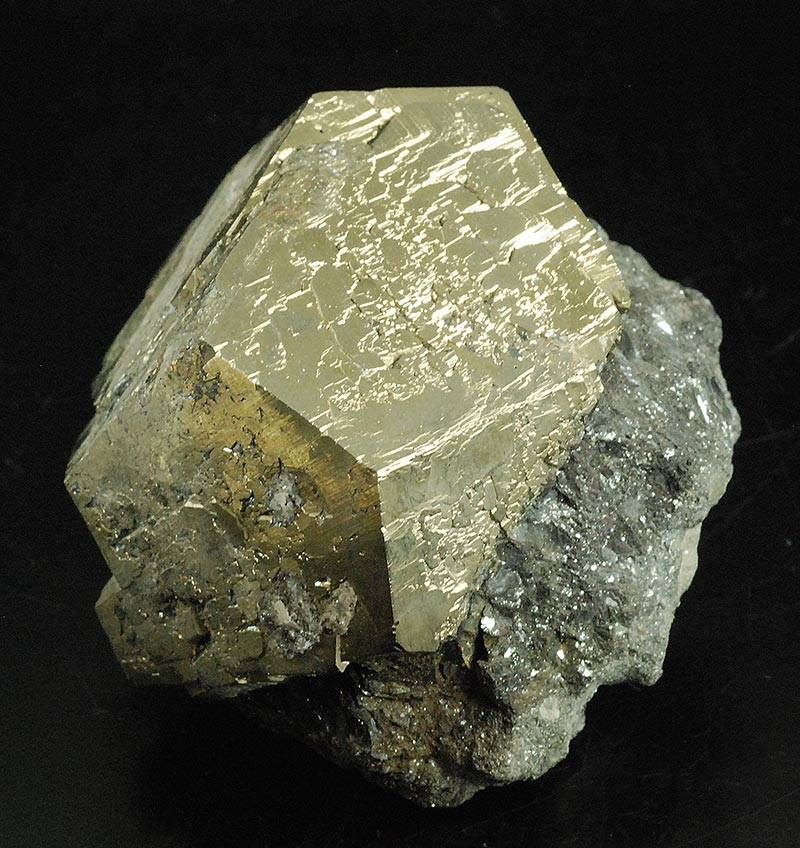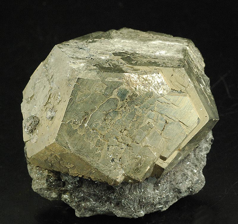 On a pinch of hematite matrix, a virtually perfect pentadodecahedral pyrite. It actually consists of at least two crystals almost completely interpenetrating each other.