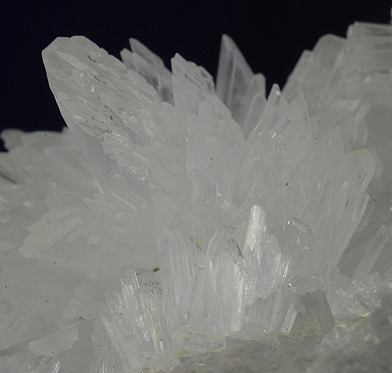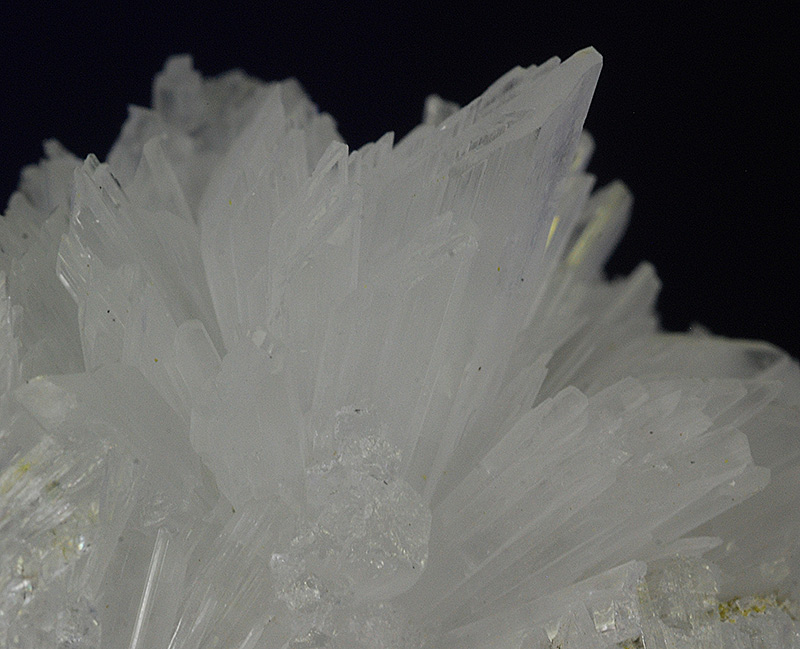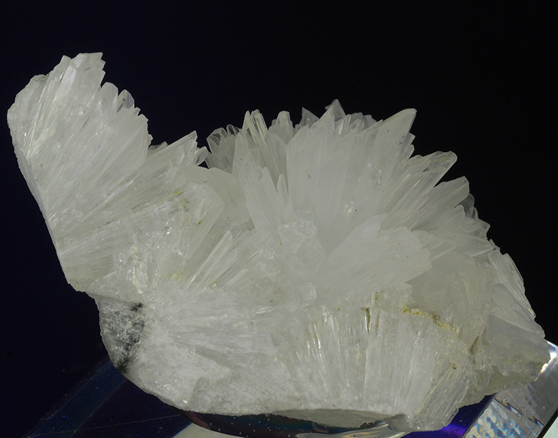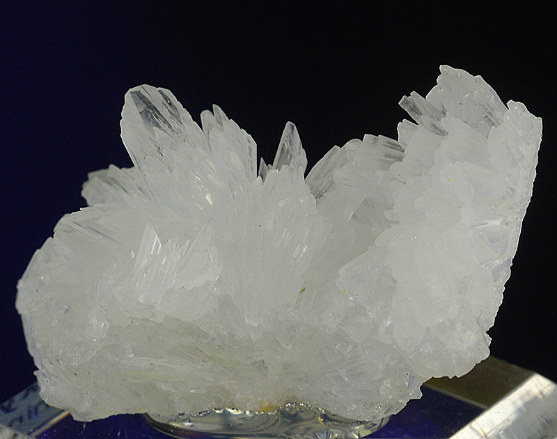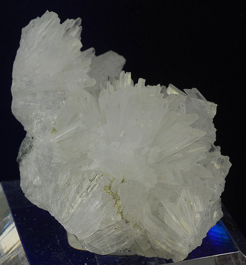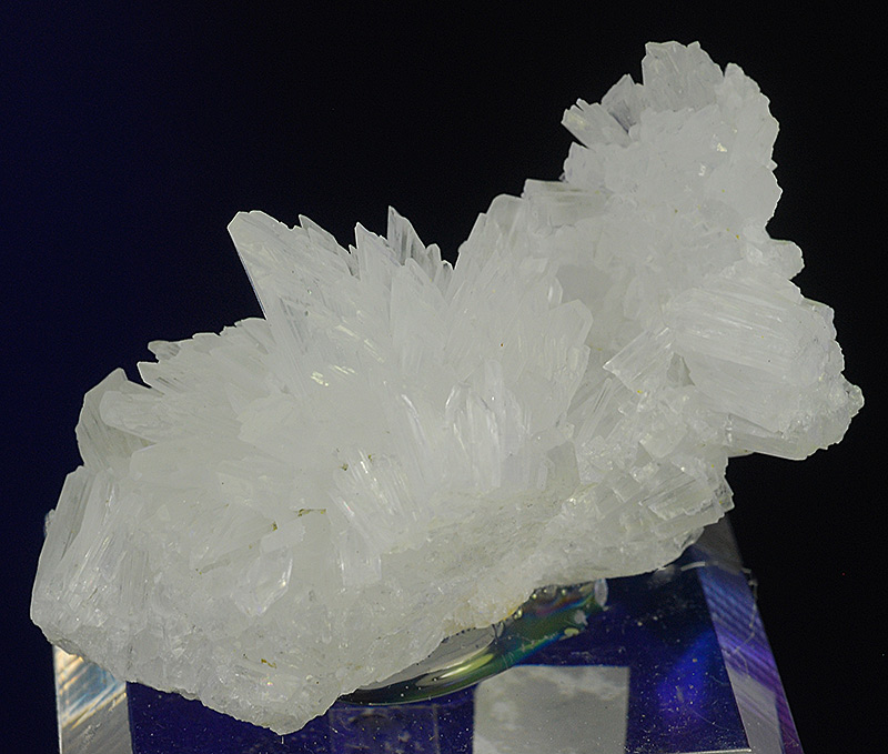 The olshanskyite is a rare borate and this is a miniature that is futuring long and perfected crystals that are scattering out from a crust of the same olshanskyite. It's a very difficult material to photograph because it's white without contrast: to show the details the pictures are a little underexposed and some of them are made with a polarizer filter. It's glued to the plastic bottom.