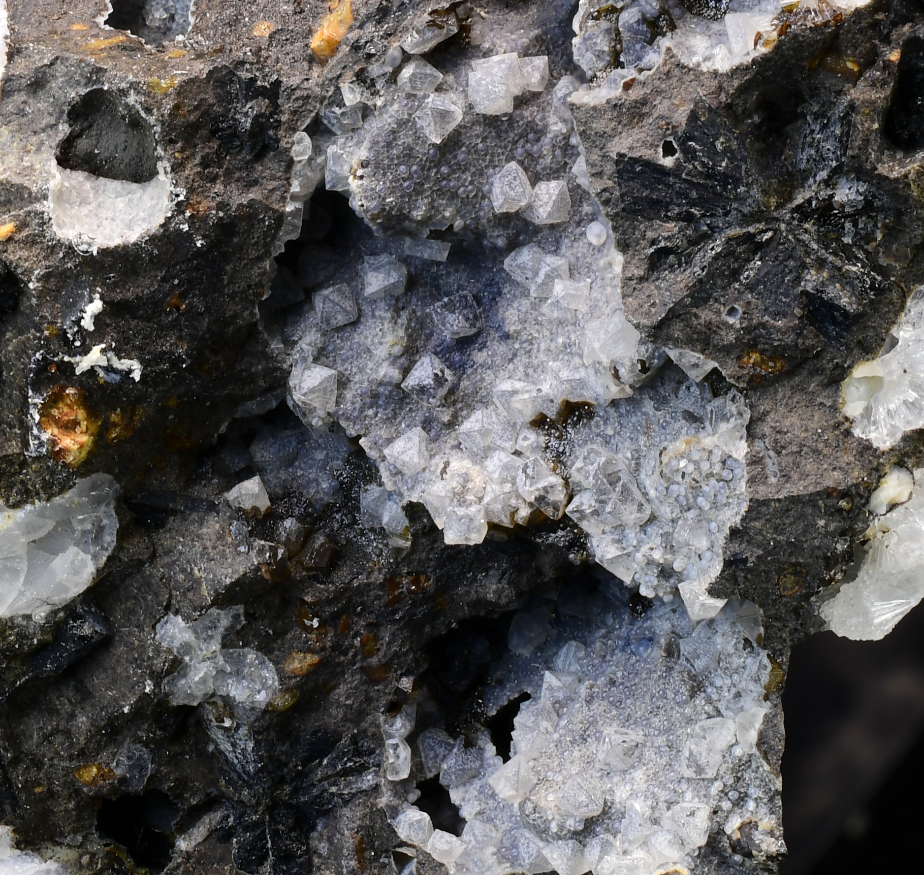 The surfaceof the vugs of this specimen are covered by several octahedrycal minicrystals of Faujasite-Na, a rare zeolite from the type locality.