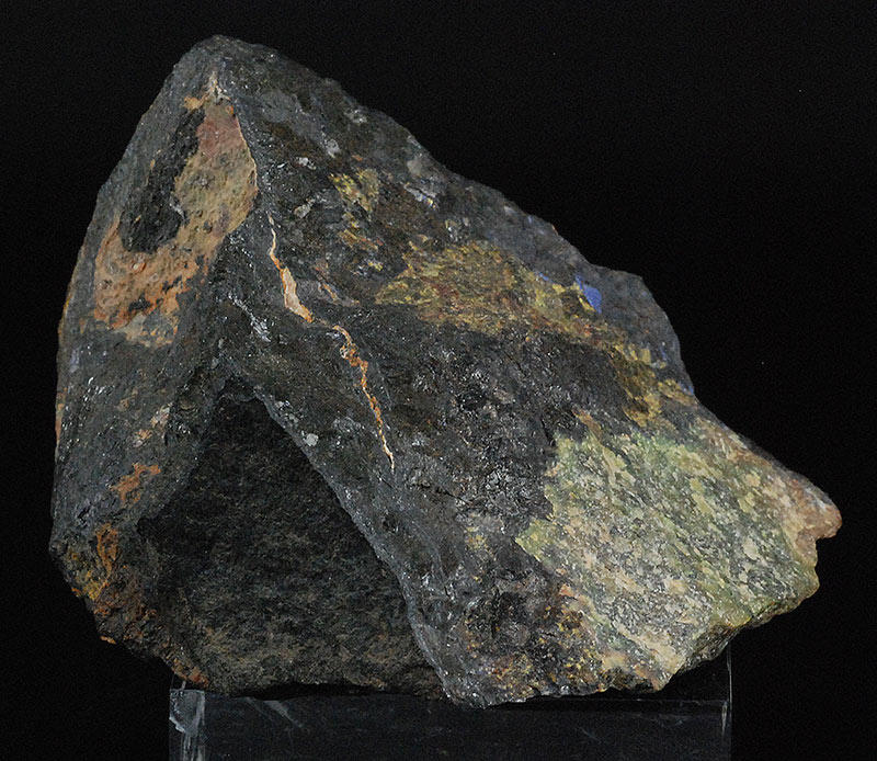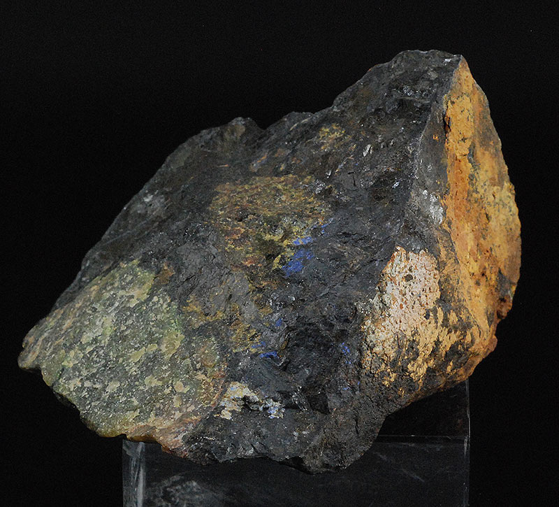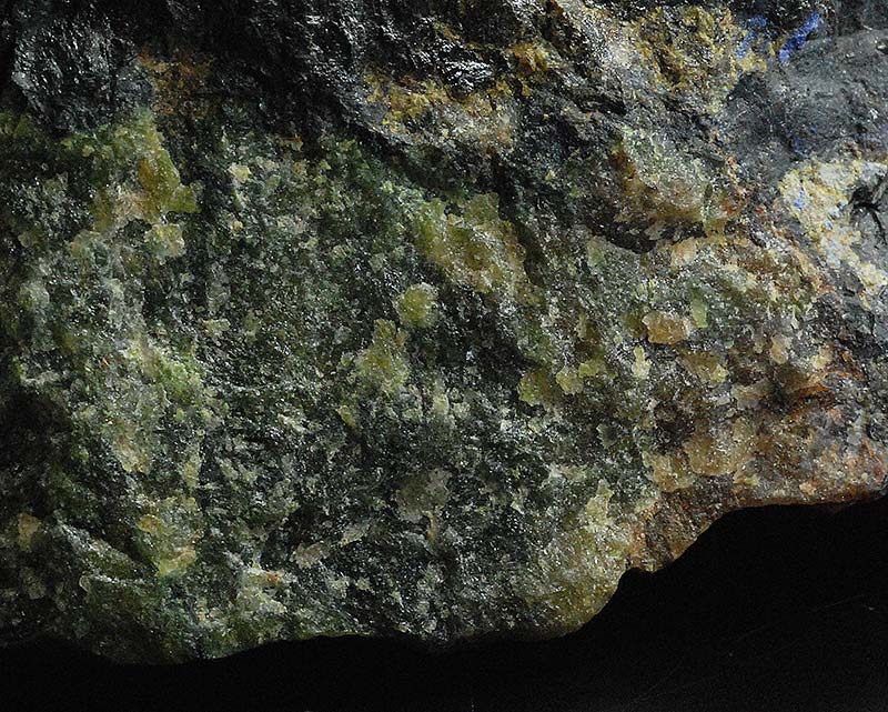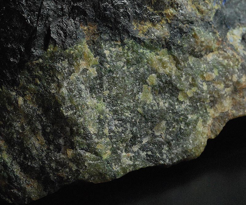 The massive green area of alluaudite is visible with the black area of litiophillite.