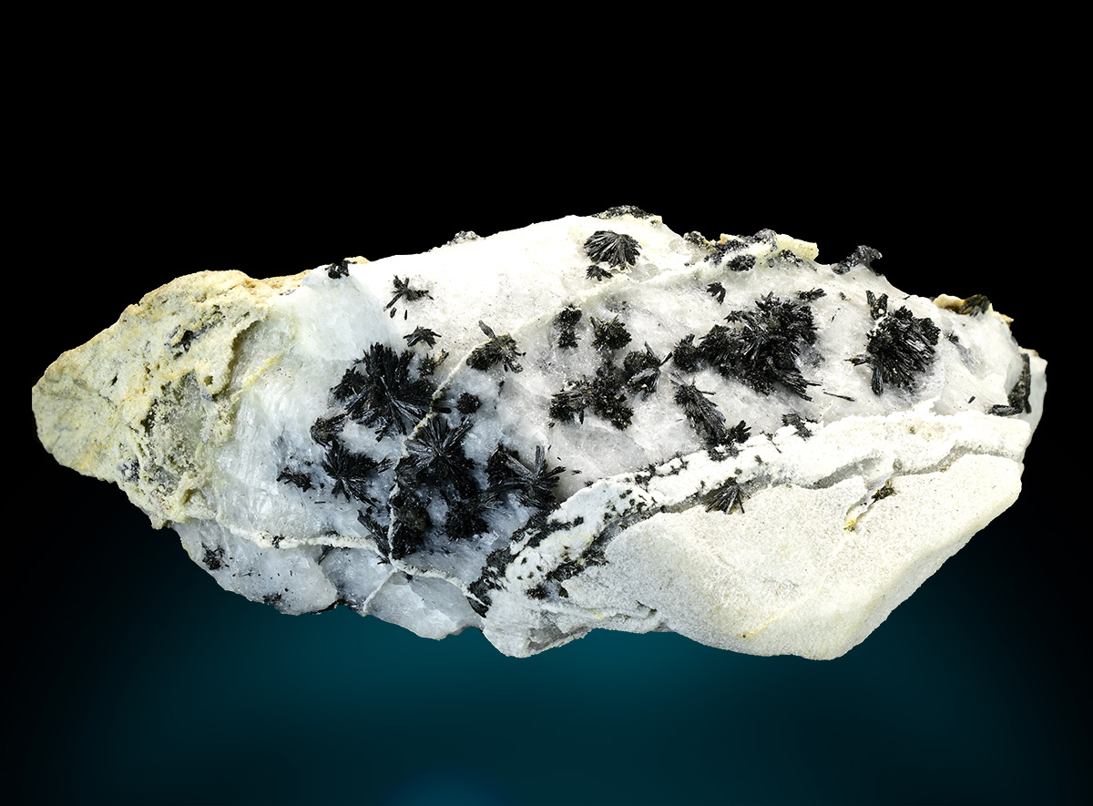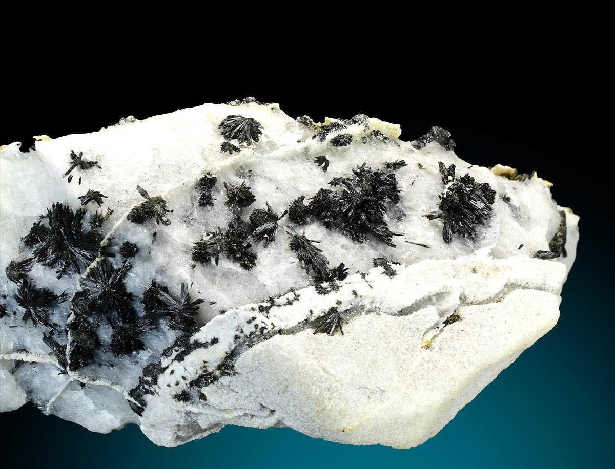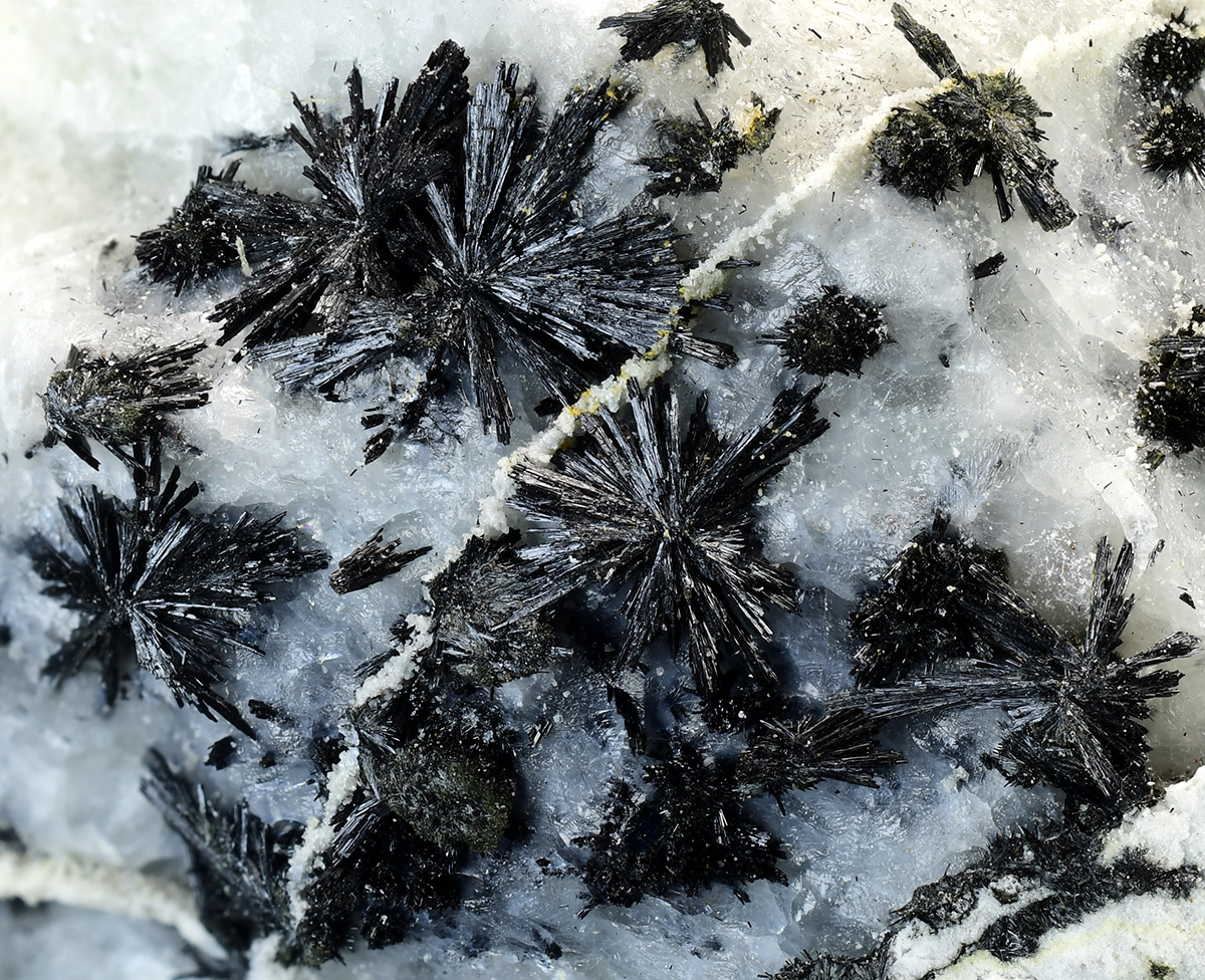 Specimen rich of black tufts of ludwigite in acicular and bright crystals up to 3 mm. A rare alpine find.