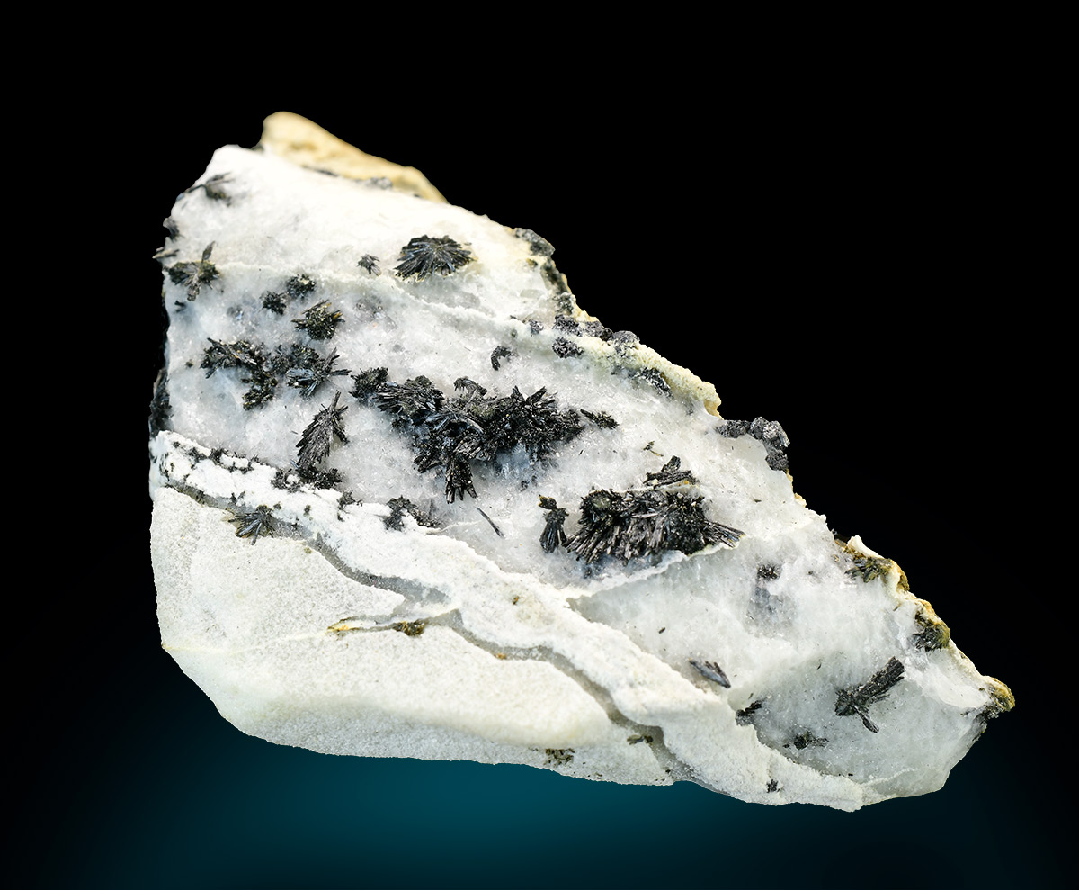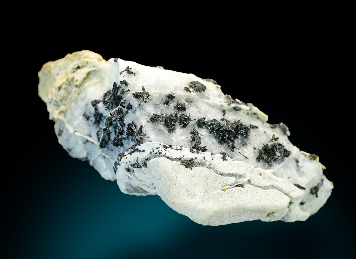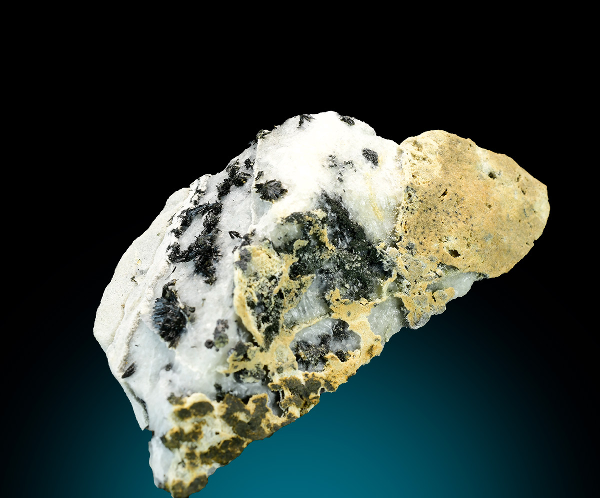 Specimen rich of black tufts of ludwigite in acicular and bright crystals up to 3 mm. A rare alpine find.