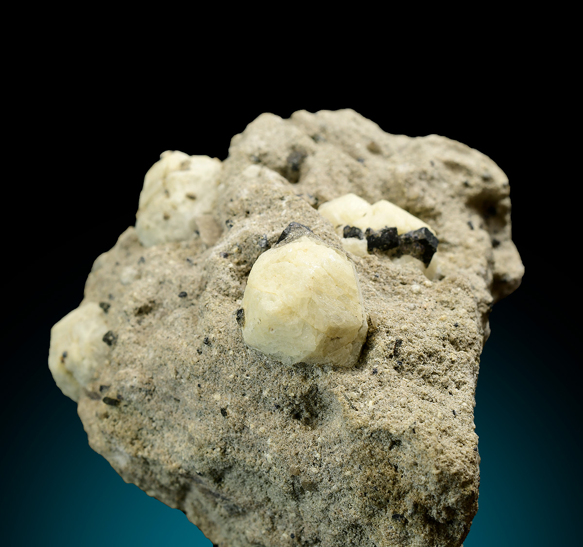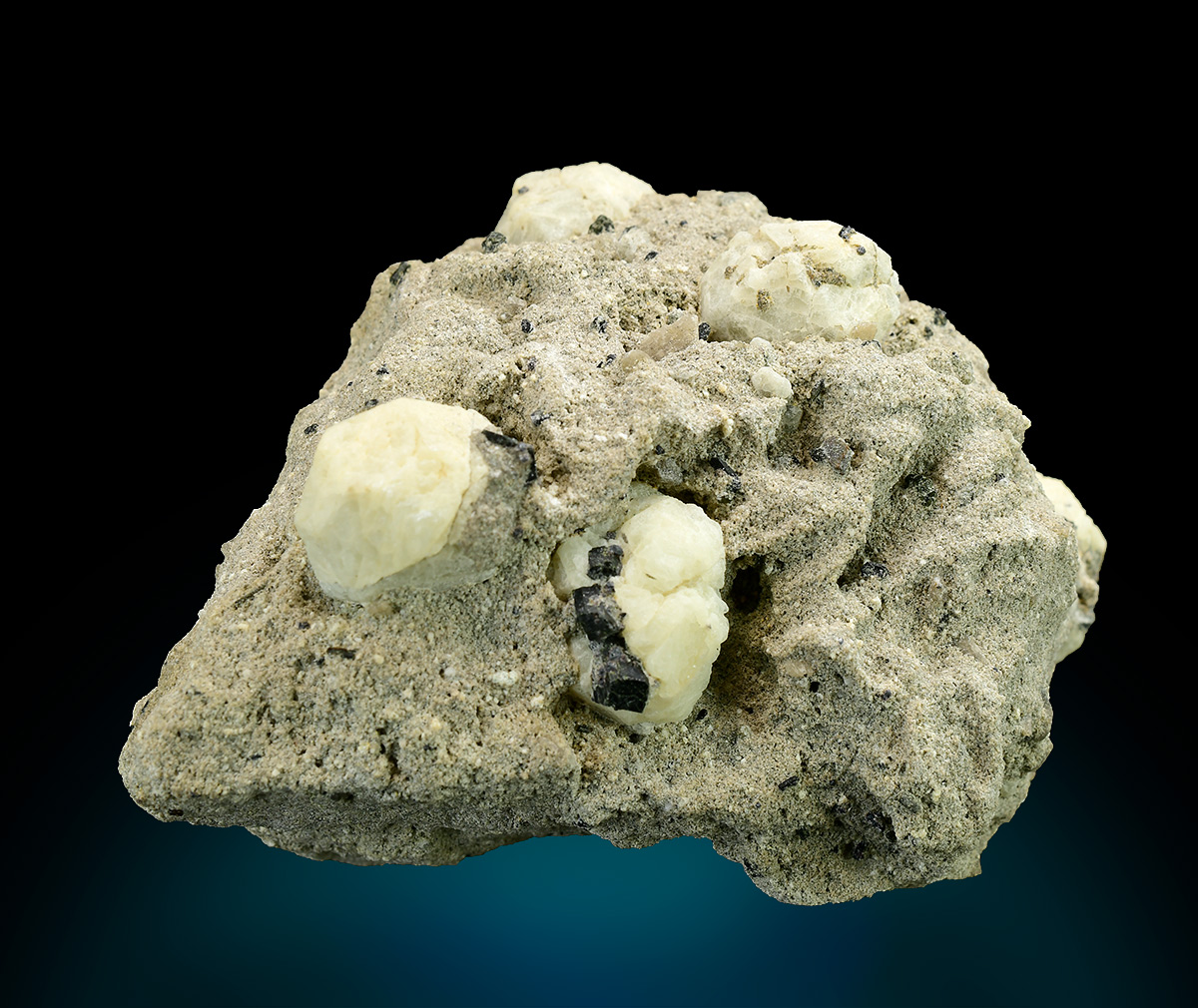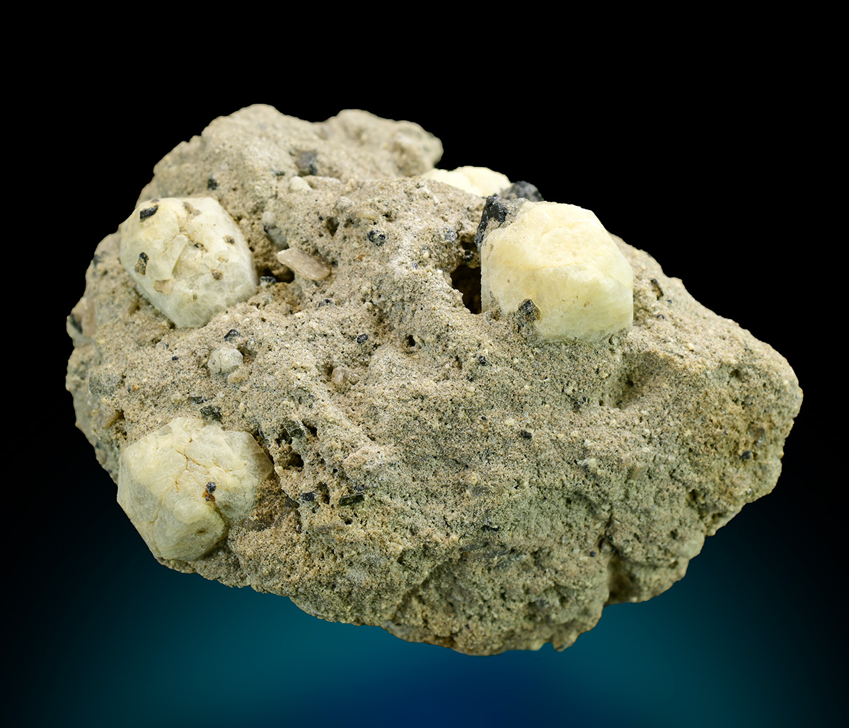 Trapezohedral Leucite crystals up to 1,4 wide with cream color on volcanic matrix. Embedded in the Leucite black augite in association.