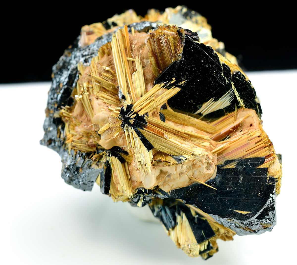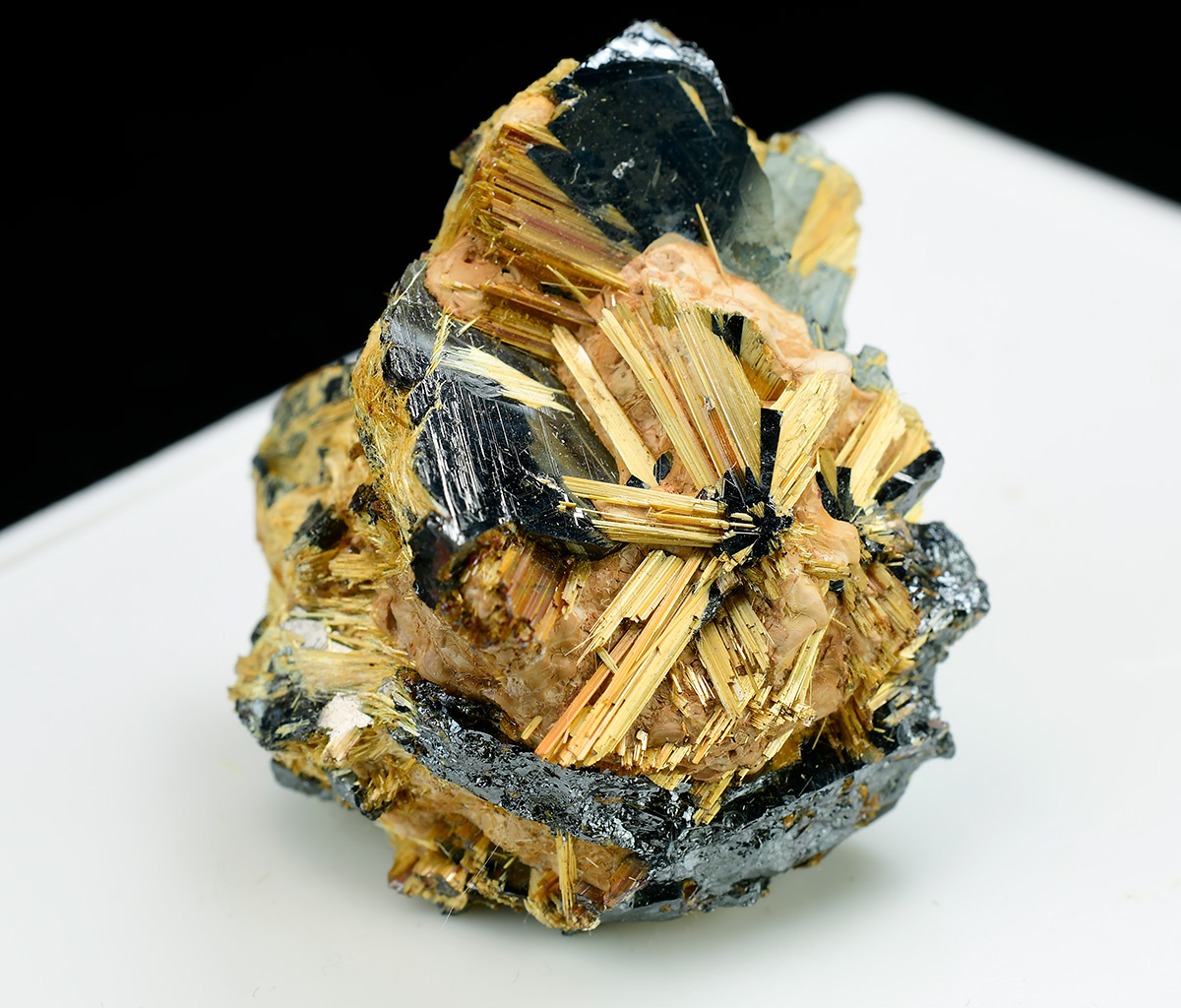 Specimen with golden rutile needle in "six star" formation up to 1,0 cm wide sticking up off shiny central hematite crystals .